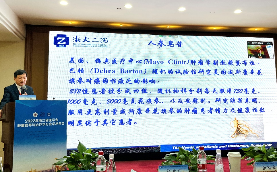 (2022年12月2-4日,中國杭州)近日,由浙江省醫學會腫瘤營養與治療學分會主辦,浙江大學醫學院附屬第二醫院協辦的「2022浙江省醫學會腫瘤營養與治療學分會學術年會」在杭州舉辦。本次會議采取線上線下相結合形式進行,邀請國內知名營養學、腫瘤學等多學科專家做學術報告,總計吸引了八百余位各科醫生、營養師、護士等相關工作者參加,此次年會也得到了美國威斯康辛州花旗參農業總會的大力支持與參與。